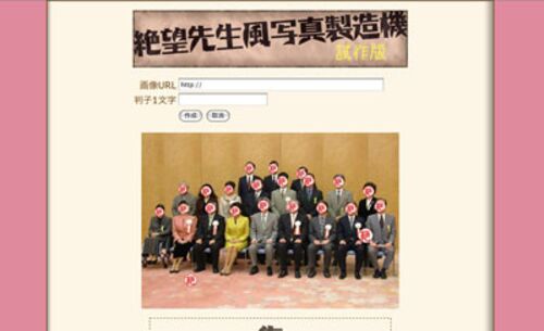画像URLと一文字を入力するだけで、絶望先生OPに出てくるような判子顔にするサービスを作成しました。 絶望先生風写真製造機 使わせていただいた顔認識のAPIは矢野さとるさんのURL2FACE、そしてフォントはフリーのしねきゃぷしょんを使わせていただいてます…